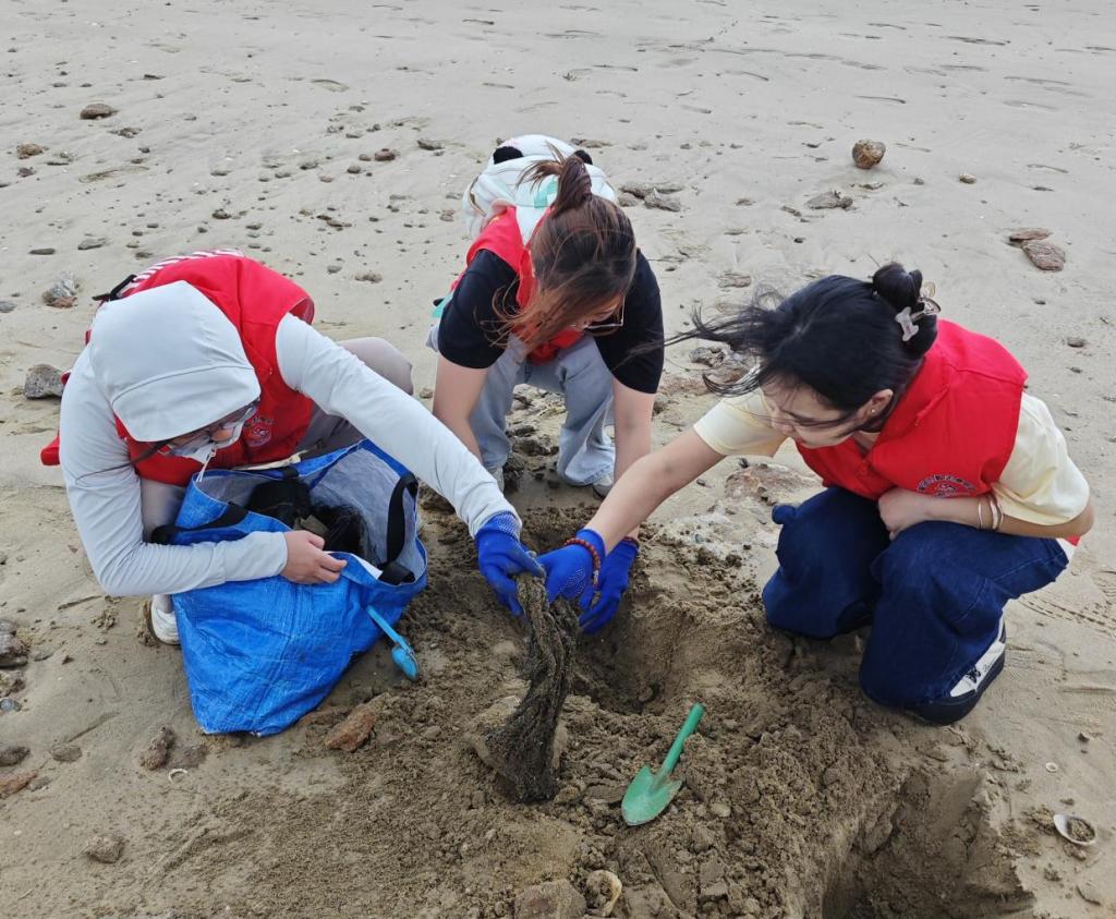 近2公里的海岸线上,队员们分组行动,手持工具细致清理沙滩缝隙与礁石角落的废弃物。从烟头到渔网,从塑料瓶到泡沫碎片,每一次弯腰拾捡都是对“挺膺担当”的生动注解。垃圾分拣环节中,大家结合科普知识交流降解周期与环境影响,让“源头分类”的理念在实践中扎根。