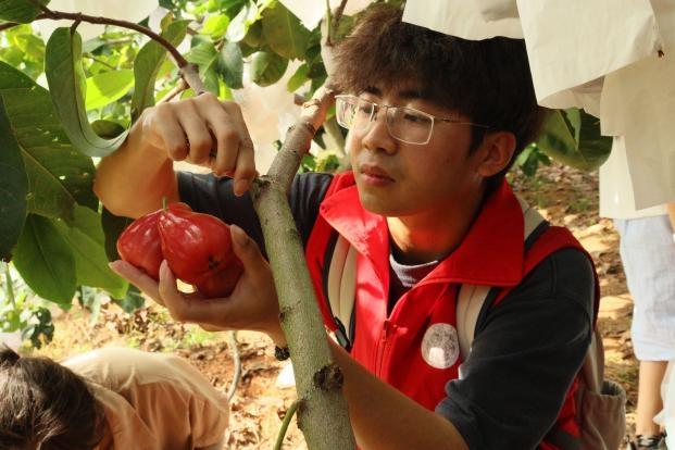 在果园负责人带领下,实践队队员亲身体验莲雾采摘、分拣与包装全流程。从规模化种植技术到电商直播销售新路径,队员们切实感受到传统农业嫁接数字技术、融合文创设计后的转型活力,见证黄厝村“艺术赋能 + 电商助农”的乡村振兴新图景。