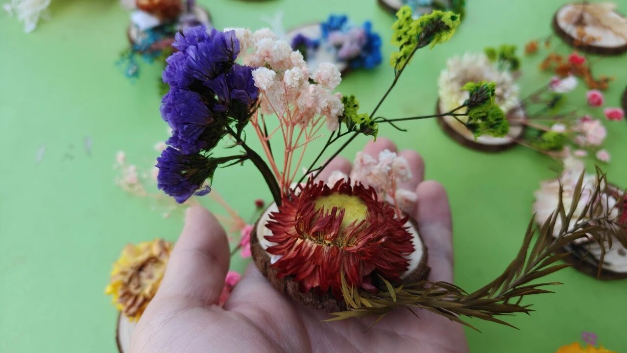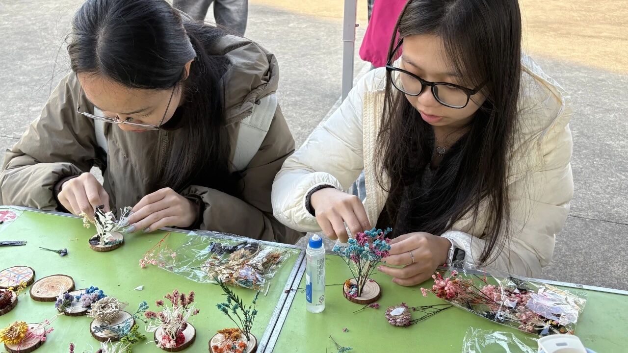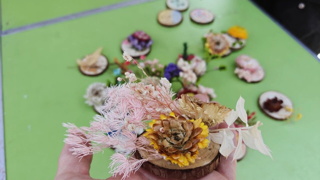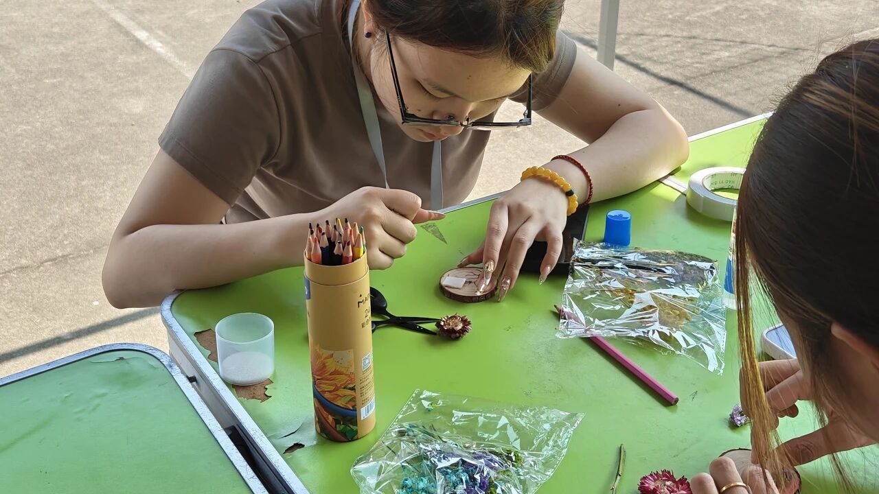 同学们领取天然木质年轮片作为专属创作底板,以花草勾勒四季更迭,用色彩描绘树木与生灵的共生,每一件作品都凝聚着对自然的观察与热爱。