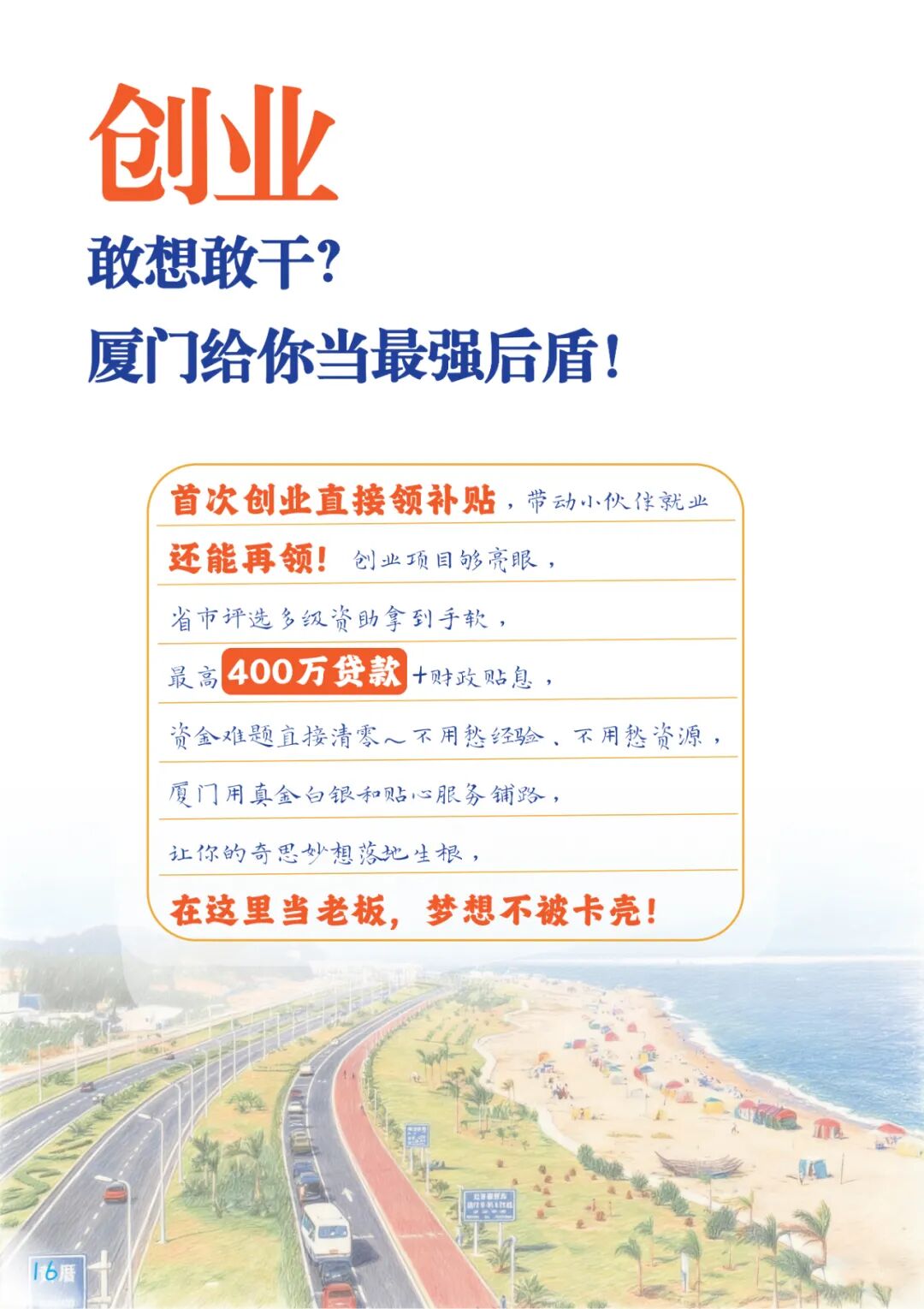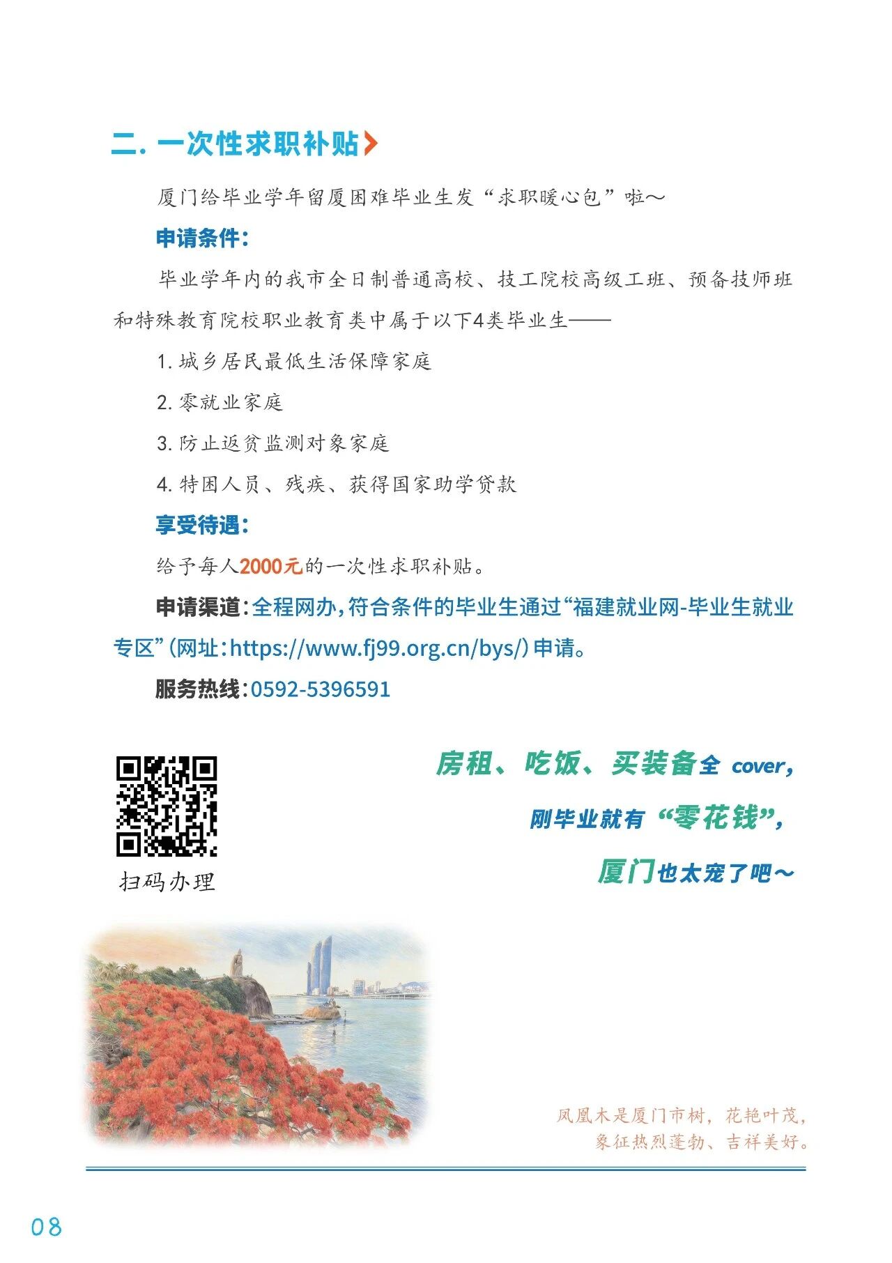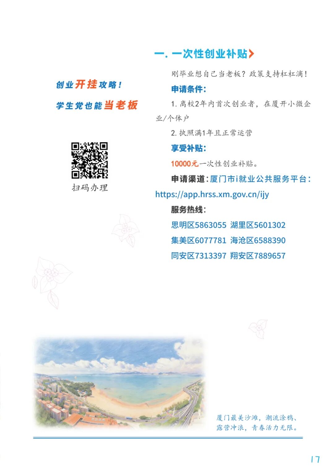 手册“就业”“创业”篇章,带您挖掘事业第一桶金:2000元一次性求职补贴,6000-80000元新引进人才生活补贴、博士后百万补贴;10000元一次性创业补、创业带动就业补、创业项目资助、创业担保贷款……留厦逐梦看你的,补贴保障看我的!
